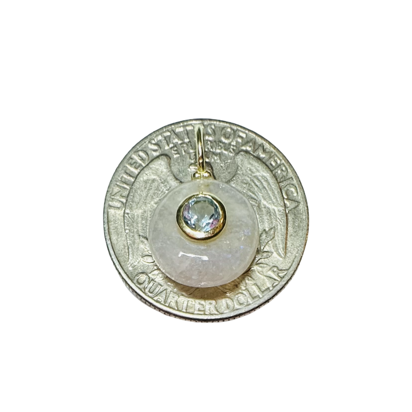 925 Sterling silver with 18k gold, moonstone and blue topaz, 16” long + 2” extension.