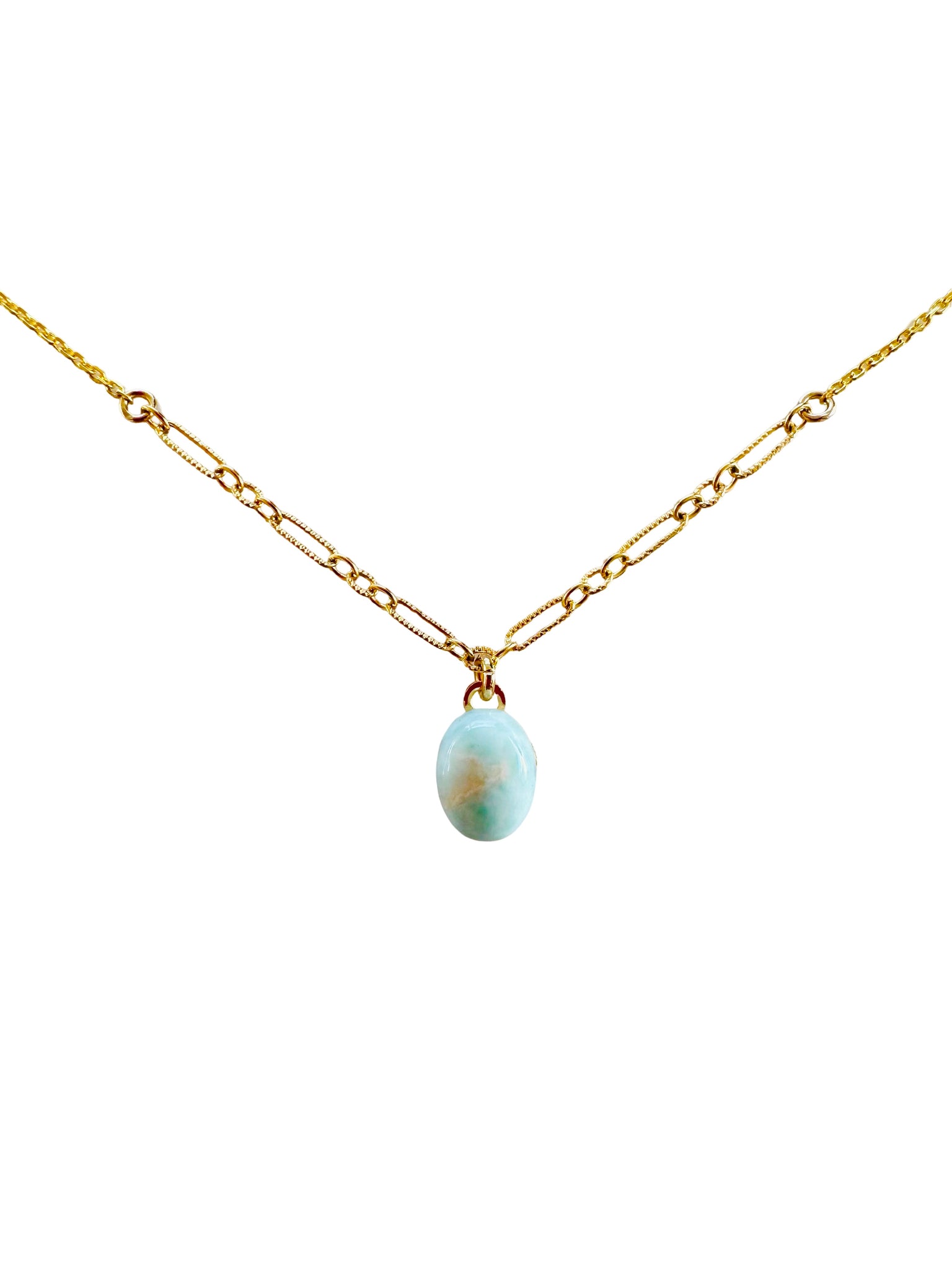 925 Italian sterling silver with 18 gold, Larimar stone and e-coating. 16” long + 2” extension.
