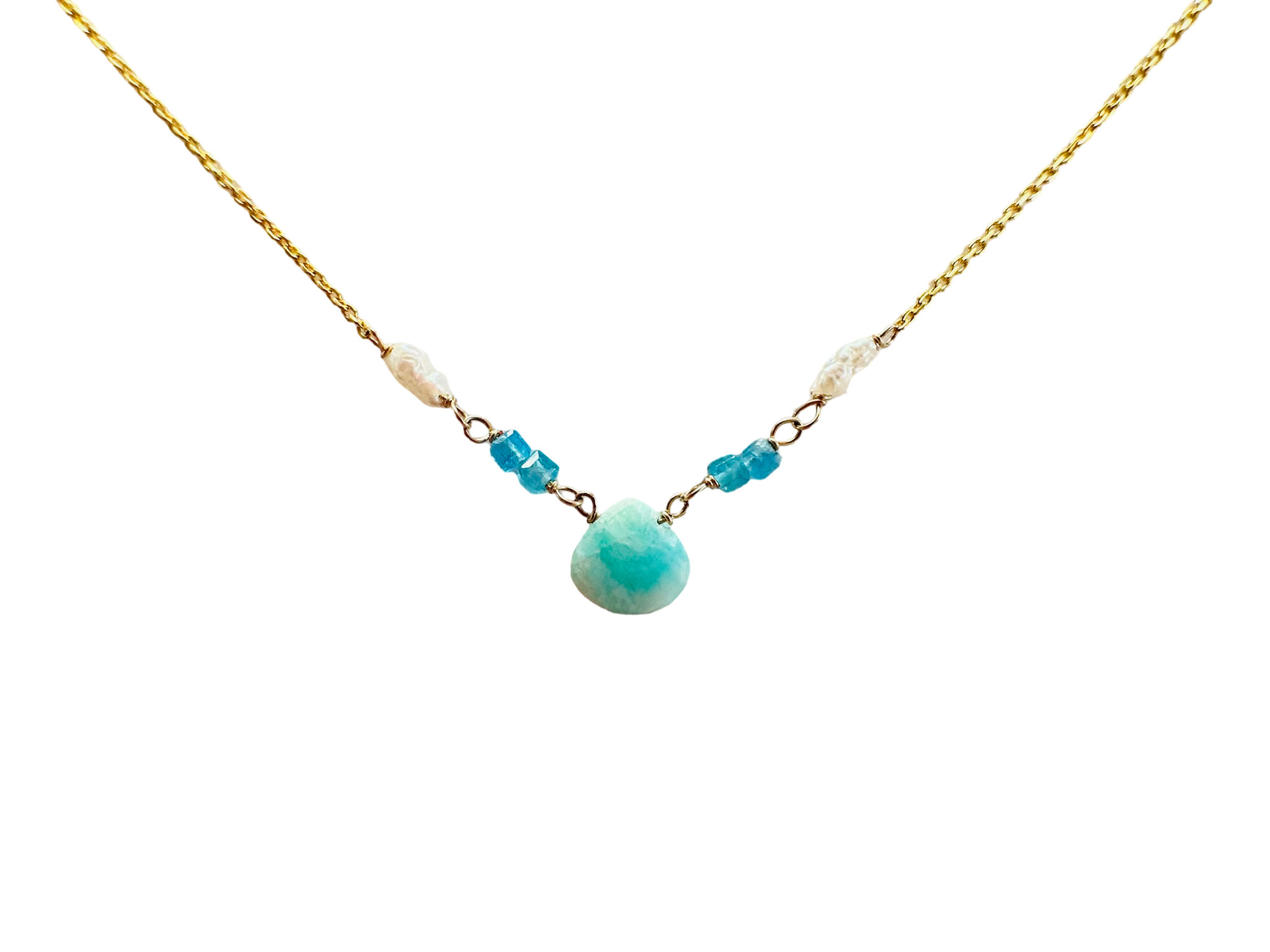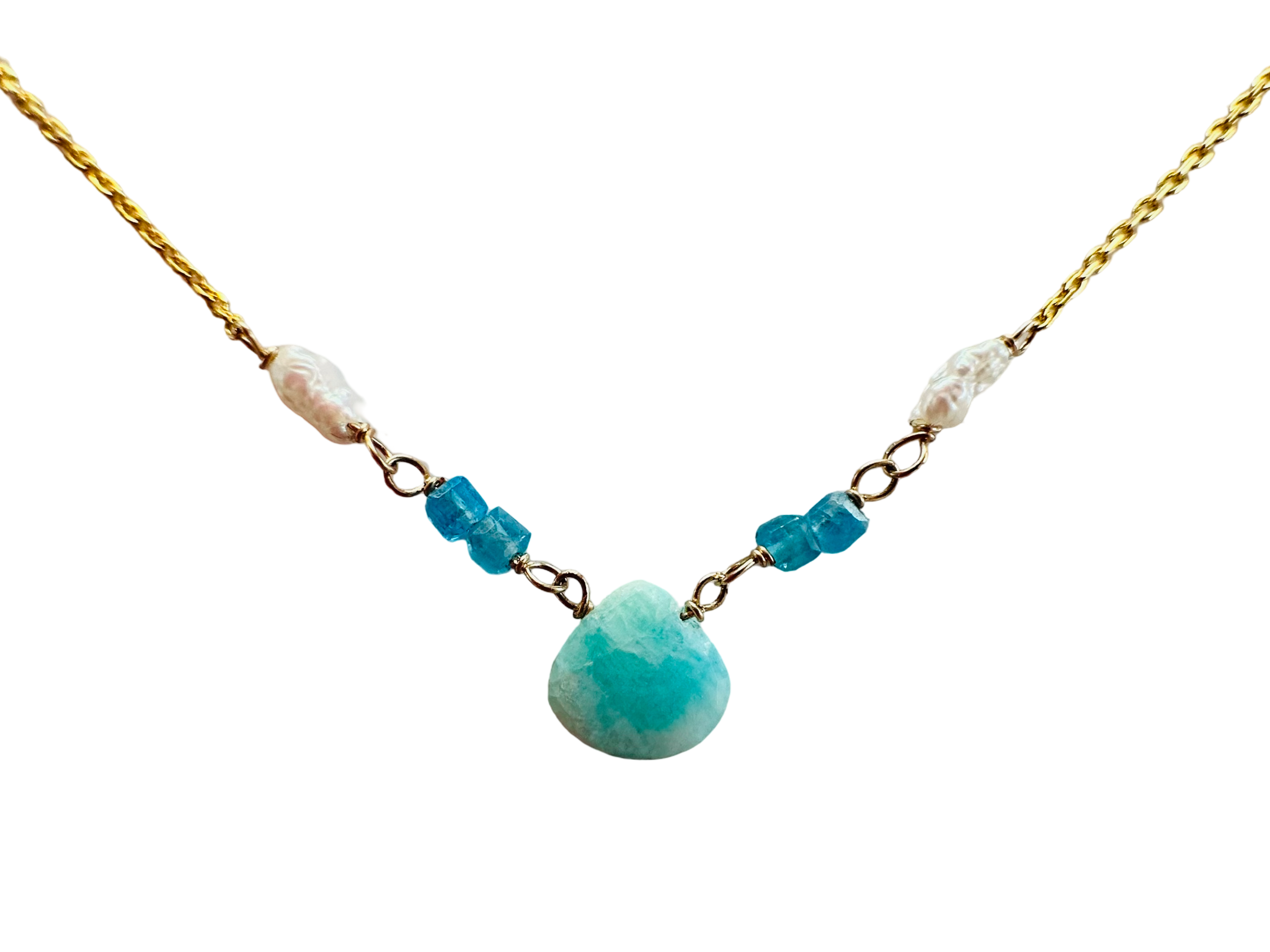 925 Sterling silver with 18k gold, semi precious stones and e-coat. 16” long