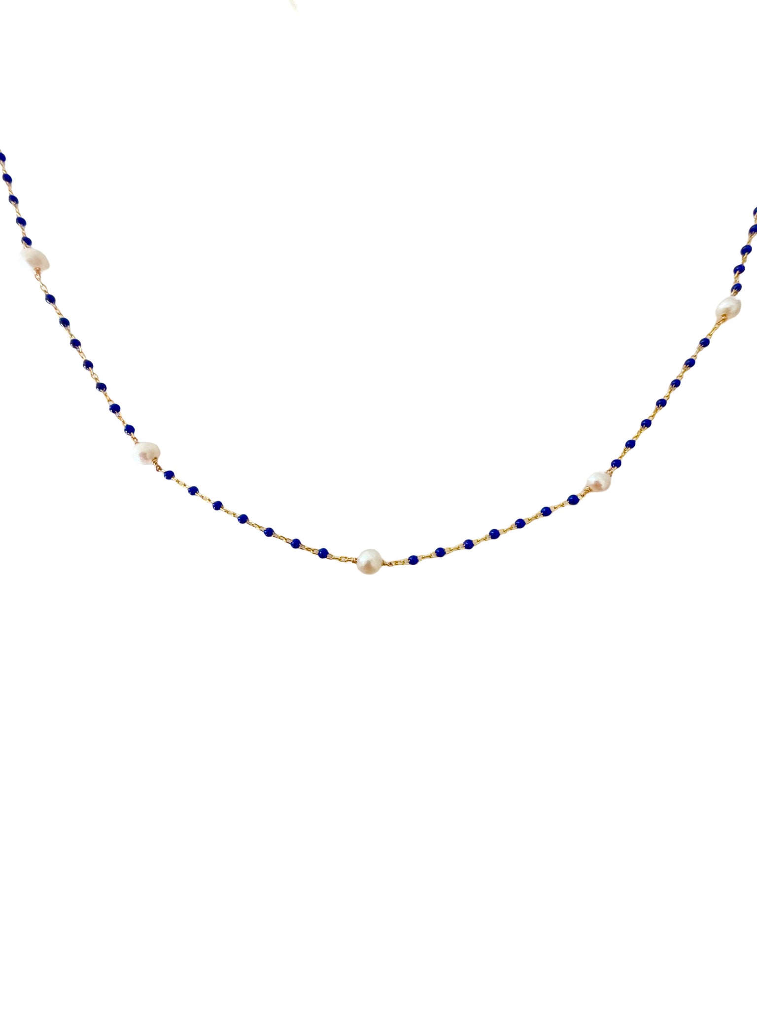 925 sterling silver with freshwater pearls and navy blue enamel, 14” long + 2” extension