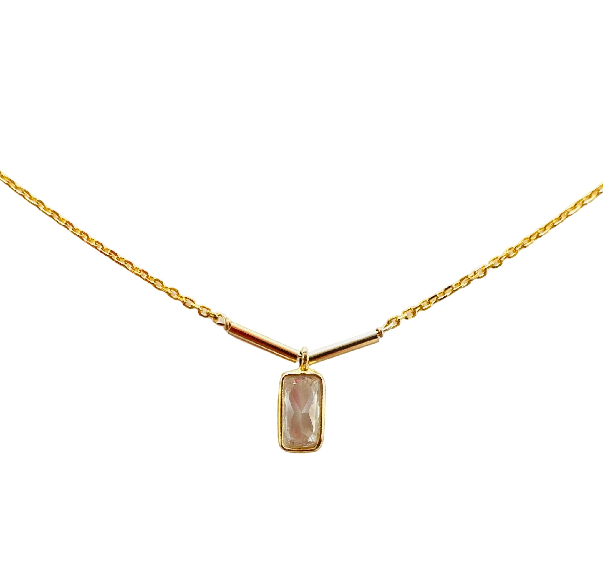 925 Sterling silver with 18k gold, cubic zirconias and e-coat. 16” long