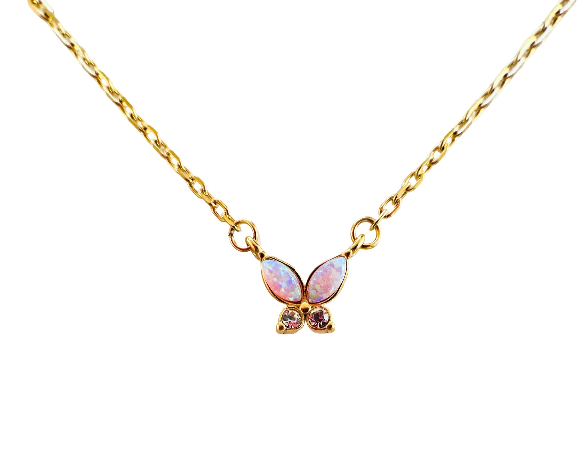 Stainless Steel with 18k gold, cubic zirconias and lab opal, 16” long with extension